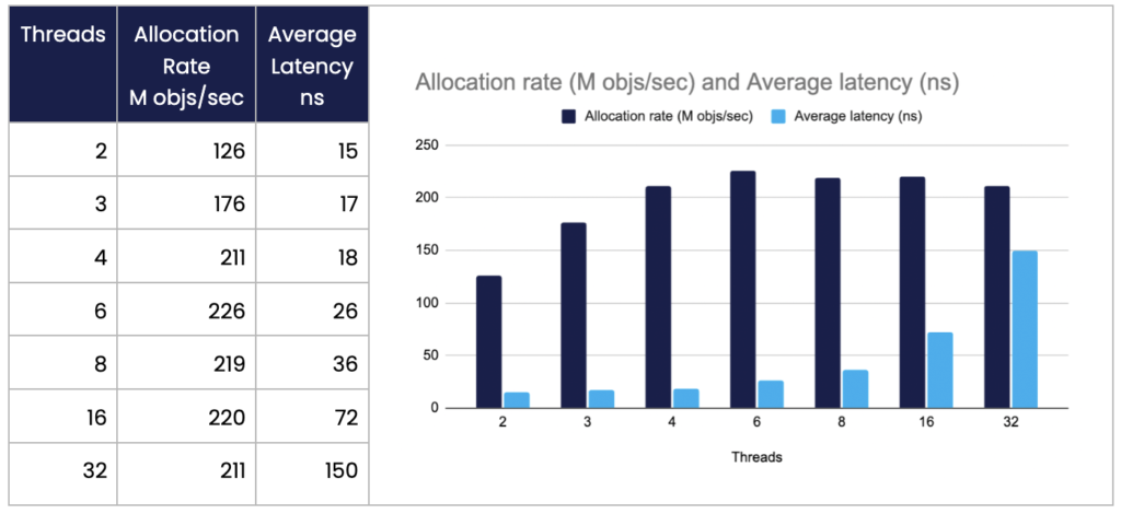 仅在多个 CPU 上创建短期 TopOfBook 对象的基准测试会产生类似的结果。这表明即使是少量内核,新对象的分配速率也会很快饱和,从而增加更多线程的平均延迟。这适用于相同的 44 字节小对象。