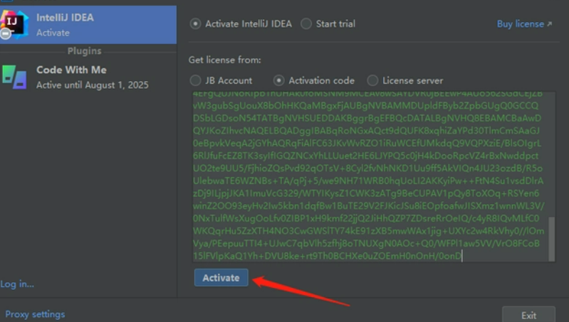 提取当前最新的IDEA激活码后,只需在IDEA激活窗口中选择Activate IntellIj IDEA,然后在Activation Code窗口中粘贴IDEA激活码即可。
