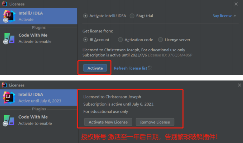 账号激活教程 admin • 1天前 • 程序员 本教程适用于 JetBrains 全系列产品,包括 Pycharm、IDEA、WebStorm、Phpstorm、Datagrip、RubyMine、CLion、AppCode 等。 1、 打开软件,点击Log in to JetBrains Account 2、 弹出浏览器窗口,选择continue with email,输入用户名、密码;跳出Authorization Successful后,回到软件 3、回到软件,点击Activate (有的账号需要点击后面Refresh license list 刷新下) 无需任何插件破解,官网专业版,不用重新安装,win/mac/linux系统均可使用。 发布者:admin,转转请注明出处:https://www.ajihuo.com/soft/5978.html 赞 (797) admin 0 15 生成海报 Phpstorm激活码(资源是从官网购买,仅供学习和交流) 上一篇 1天前 Webstorm激活码(资源是从官网购买,仅供学习和交流) 下一篇 1天前 相关推荐 程序员 在 Java 中运行 100 万个线程 在本文开始前,先给大家分享几个好用的IDEA激活码 这里提供几个最新的激活码,有需要的朋友可以试试,先到先用: 2022和2023Intellij IDEA最新激活码,IDEA稳定专属激活码(持续更新) 2022和2023Pycharm激活码,Pycharm稳定专属激活码(持续更新) 2022和2023Webstorm激活码,Webstorm稳定专属激活码(… admin 2023年3月7日 000 程序员 Java 设计模式:创建模式概述 在本文开始前,先给大家分享几个好用的IDEA激活码 这里提供几个最新的激活码,有需要的朋友可以试试,先到先用: 2022和2023Intellij IDEA最新激活码,IDEA稳定专属激活码(持续更新) 2022和2023Pycharm激活码,Pycharm稳定专属激活码(持续更新) 2022和2023Webstorm激活码,Webstorm稳定专属激活码(… admin 2023年4月27日 000 程序员 JSON是非常慢的:这是什么是更快! 在本文开始前,先给大家分享几个好用的IDEA激活码 这里提供几个最新的激活码,有需要的朋友可以试试,先到先用: 2022和2023Intellij IDEA最新激活码,IDEA稳定专属激活码(持续更新) 2022和2023Pycharm激活码,Pycharm稳定专属激活码(持续更新) 2022和2023Webstorm激活码,Webstorm稳定专属激活码(… admin 2023年11月6日 000 程序员 你所不知道的 Java synchronized 关键字 在本文开始前,先给大家分享几个好用的IDEA激活码 这里提供几个最新的激活码,有需要的朋友可以试试,先到先用: 2022和2023Intellij IDEA最新激活码,IDEA稳定专属激活码(持续更新) 2022和2023Pycharm激活码,Pycharm稳定专属激活码(持续更新) 2022和2023Webstorm激活码,Webstorm稳定专属激活码(… admin 2023年6月19日 000 程序员 我是如何通过所有面试的?— 新生指南 在本文开始前,先给大家分享几个好用的IDEA激活码 这里提供几个最新的激活码,有需要的朋友可以试试,先到先用: 2022和2023Intellij IDEA最新激活码,IDEA稳定专属激活码(持续更新) 2022和2023Pycharm激活码,Pycharm稳定专属激活码(持续更新) 2022和2023Webstorm激活码,Webstorm稳定专属激活码(… admin 2023年3月29日 000 发表回复 请登录后评论...登录后才能评论 提交 评论列表(15条) 匿名 2024年5月14日 下午4:42 一年可用,感谢大佬 回复 afanyang 2024年12月2日 下午8:55 @匿名:感谢大佬 回复 2056009171 2024年6月27日 下午4:22 赞,一年可用,感谢感谢 回复 hasagei 2024年6月28日 上午11:21 感谢大佬 回复 匿名 2024年7月1日 上午9:36 牛逼牛逼 到2025年 回复 匿名 2024年7月1日 上午11:36 感谢 回复 小龙仔 2024年7月2日 上午9:36 大佬牛逼!!!!!!感谢大佬!!! 回复 匿名 2024年7月3日 上午10:46 感谢大佬❤️❤️❤️ 回复 匿名 2024年7月3日 上午10:46 感谢大佬❤️❤️❤️ 回复 aihg 2024年8月20日 上午10:11 感谢大佬 回复 哈哈 2024年9月2日 下午8:10 谢谢大佬 回复 Donut 2024年9月18日 上午9:29 感谢大佬 回复 念 2024年9月20日 下午3:05 感谢大佬 回复 林杨 2024年12月1日 下午4:50 哇感谢大佬! 回复 随风 2024年12月5日 上午10:44 感谢大佬 回复